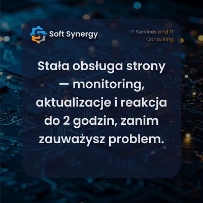 Stała obsługa strony internetowej to nie jednorazowa naprawa, tylko systematyczna opieka. W Soft Synergy pracujemy według modelu „ciągłej dostępności" — monitorujemy witrynę, aktualizujemy zabezpieczenia i reagujemy na problemy, zanim Ty w ogóle je zauważysz.
